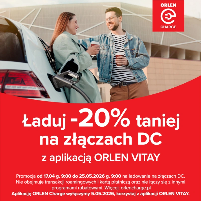 Najważniejsze jest dla nas to, aby kierowcy aut elektrycznych mogli ładować swoje samochody taniej wtedy, kiedy najbardziej tego potrzebują – w codziennych dojazdach i w trasie. Dlatego uruchamiamy wiosenną promocję ORLEN Charge, w ramach której przez kilka tygodni obniżamy koszt ładowania prądem stałym (DC) o 20% w całej naszej sieci. To prosta, czytelna korzyść: niższa cena za każdą kilowatogodzinę bez dodatkowych warunków. Promocja jest dostępna zarówno w aplikacji ORLEN Charge, jak i w ORLEN VITAY z aktywną usługą ORLEN Charge.